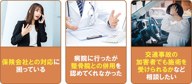 A. はい、受けられます。事故の責任割合に関わらず、身体に痛みや違和感があれば早めのケアが重要です。ご自身の自動車保険(人身傷害補償など)が使える場合もありますので、まずはご相談ください。